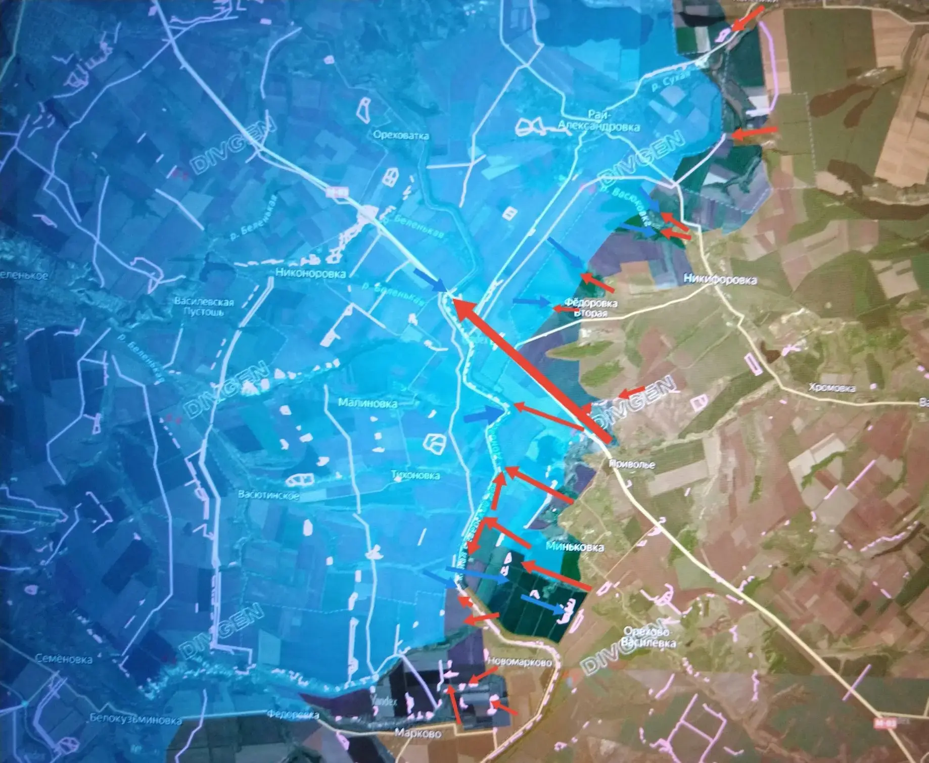 Противник, пытавшийся контратаковать в районе Миньковки, полностью выбит из неё и Миньковского леса. Наши подразделения продвинулись дальше, западнее, в направлении Тихоновки, до канала Северский Донец - Донбасс. Наносятся удары по противнику, ещё удерживающему позиции в полях/посадках между каналом и Миньковкой, южнее её и юго-западнее.