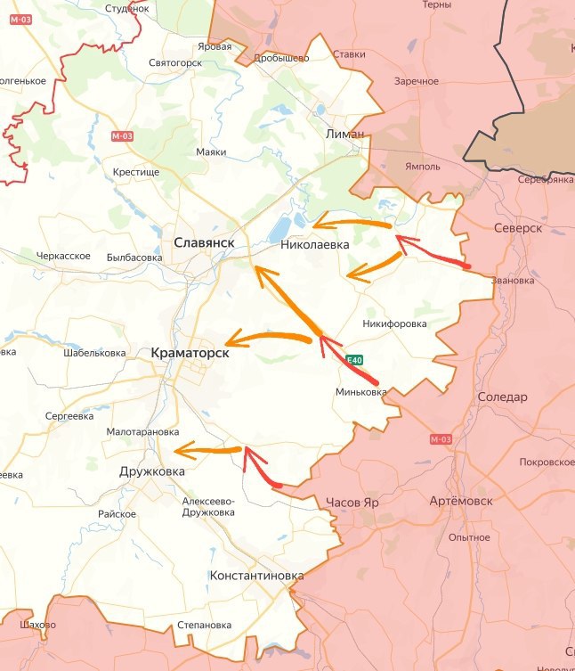 Часов Яр – продвижение здесь идёт северо-восточнее Константиновки с целью дойти до Белокузьминовки, от которой можно начинать "накаты" в сторону Дружковки. Северск – задача наступления здесь зацепиться за Кривую Луку и важные высоты рядом с населённым пунктом, чтобы усугубить и так плохую ситуацию для ВСУ.