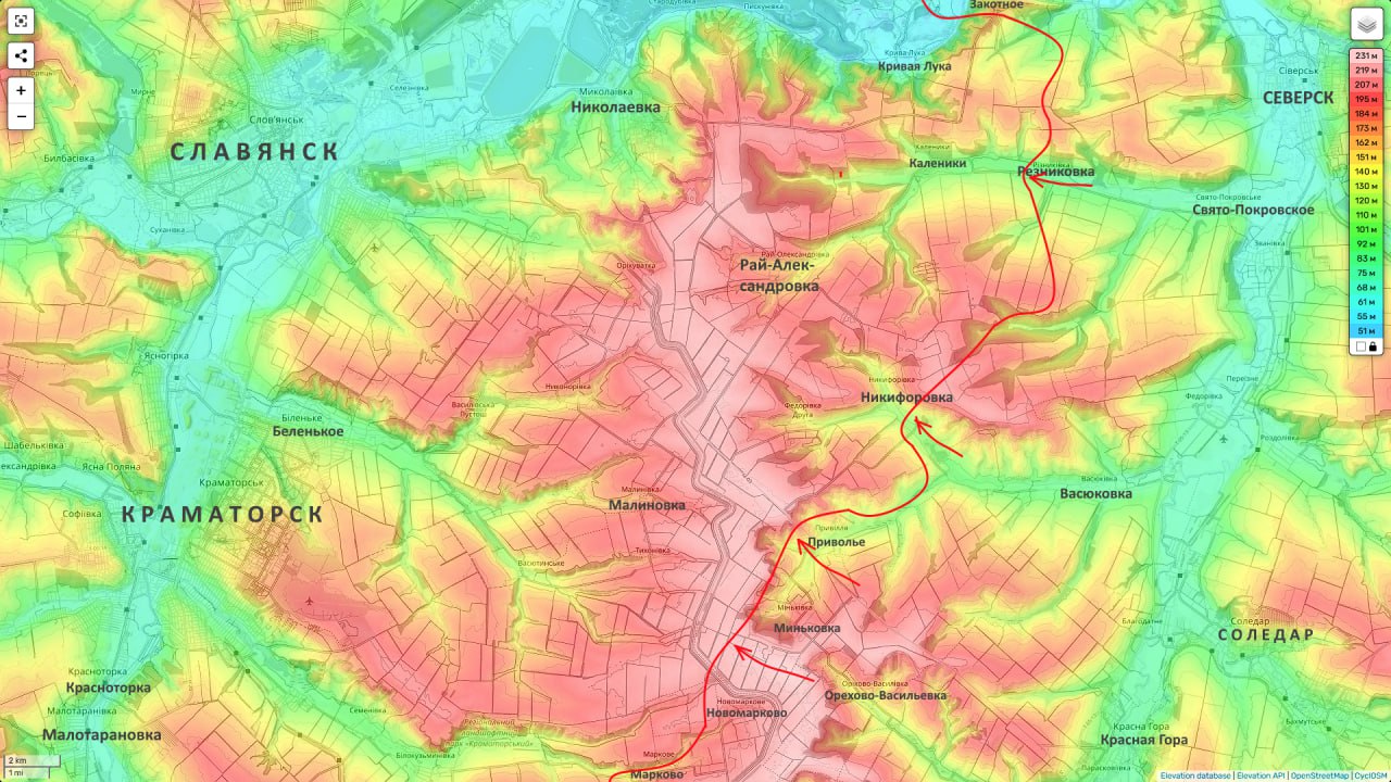 Но это значит, что нашим подразделениям удалось пересечь глубокий овраг и закрепиться на высотах севернее села. Что вместе с занятием нами Миньковки, а еще успехами южнее Закотного (где взяты стратегические высоты южнее) и в районе Резниковки с Никифоровкой (здесь есть заметные продвижения по селам) показывает на схлопывание обороны противника восточнее водораздельных высот перед Славянском и Краматорском.