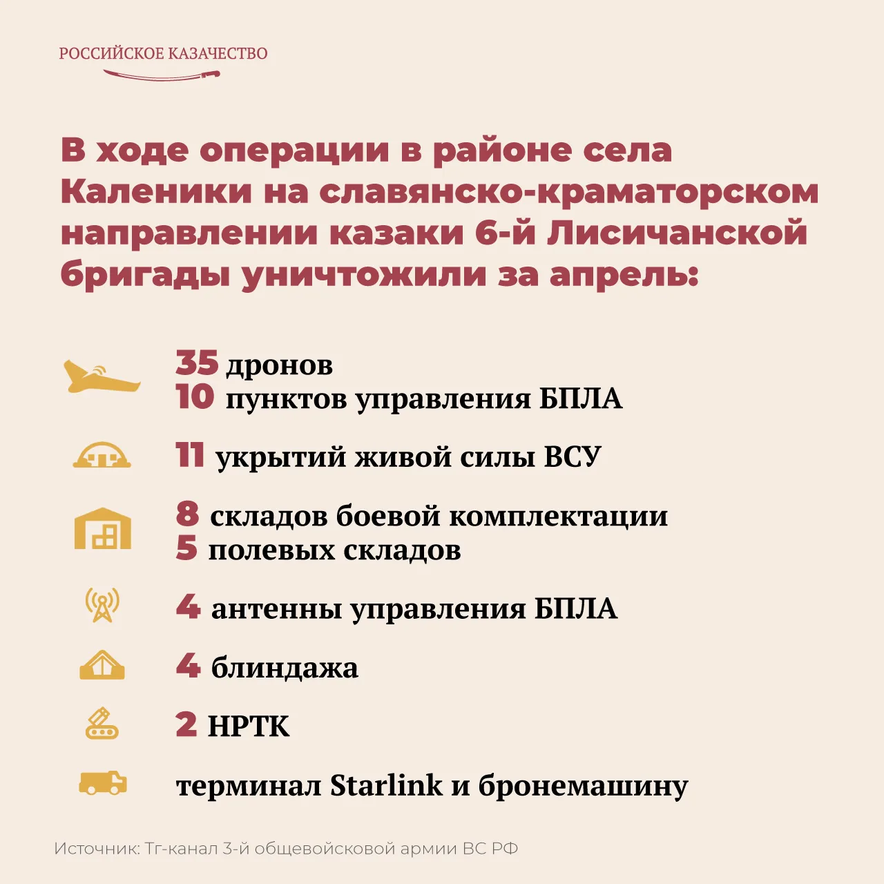 В зоне специальной военной операции в районе населенного пункта Каленики ДНР активное участие в боевых действиях принимает 6-я отдельная гвардейская мотострелковая Лисичанская казачья бригада имени М.И.Платова. О достижениях казаков на славянско-краматорском направлении сообщается в официальном телеграм-канале 3-й общевойсковой армии Вооруженных сил России.