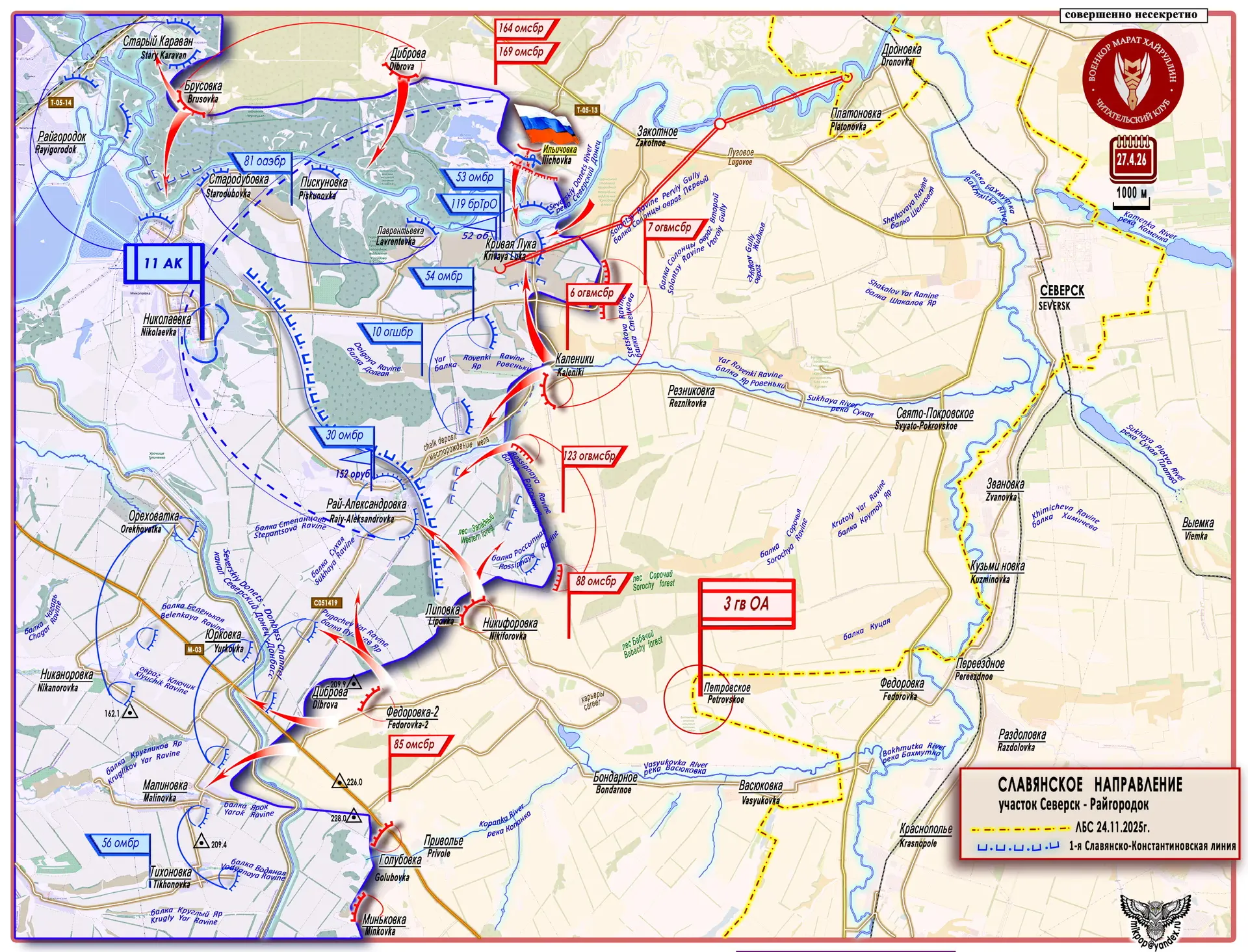 Славянский участок Донецкого направления находится под постоянным давлением российских группировок «Запад» и «Юг». На карте мы видим глубину продвижения от ЛБС 10.10.2025 г. и 24.11.2025 г.